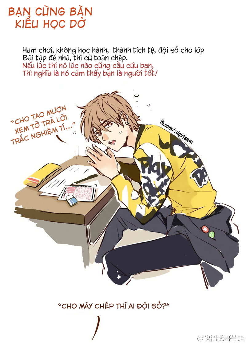dạng 1 ham chơi, không học hành, thành tích tệ, đội sổ lớp , bài tập để nhà thi cử toàn chép. Lúc kiểm tra thì toàn cầu cứu bạn trong khi … mình cũng ngu ko kém =))))))